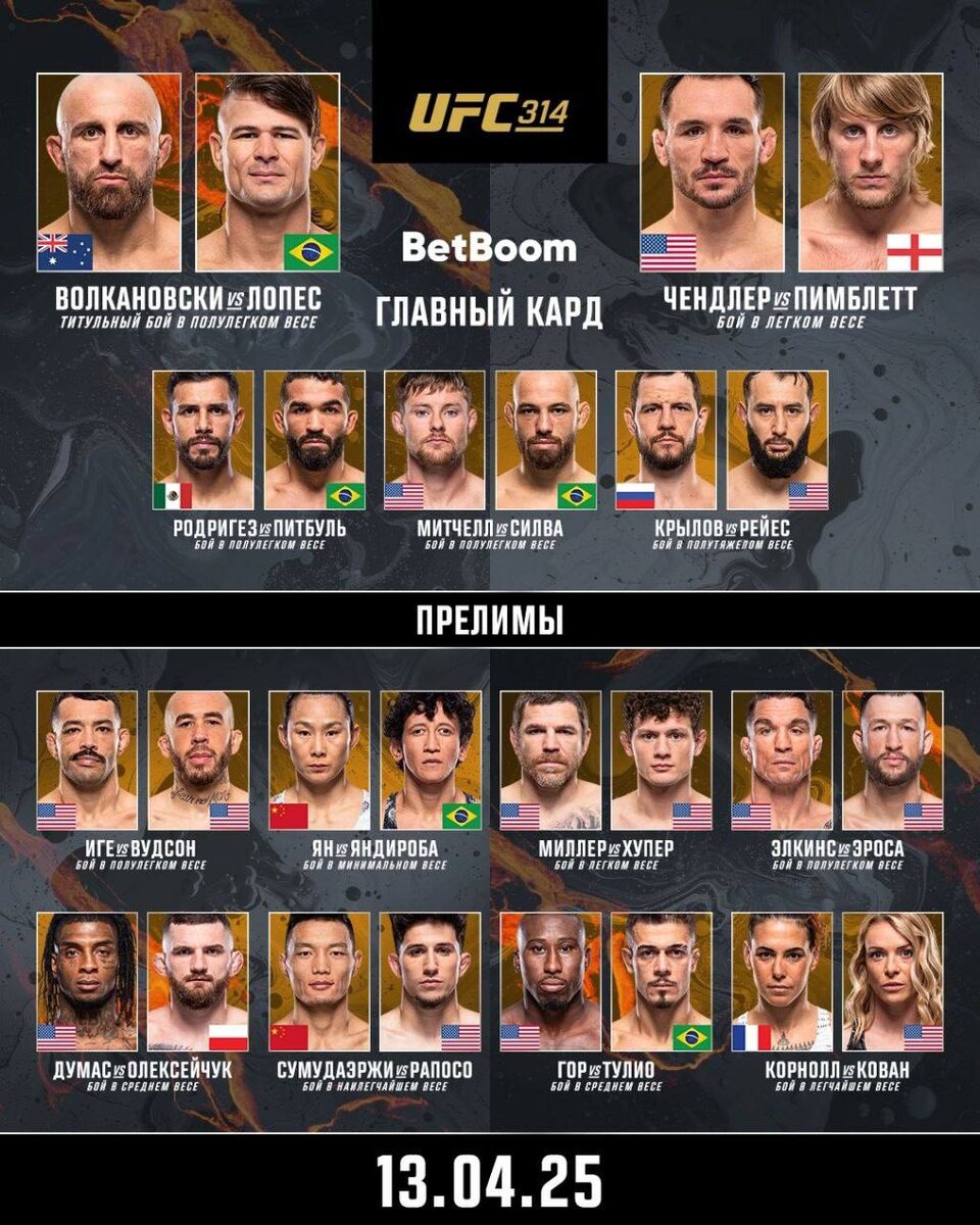 Смотрите результаты UFC 314 ниже.