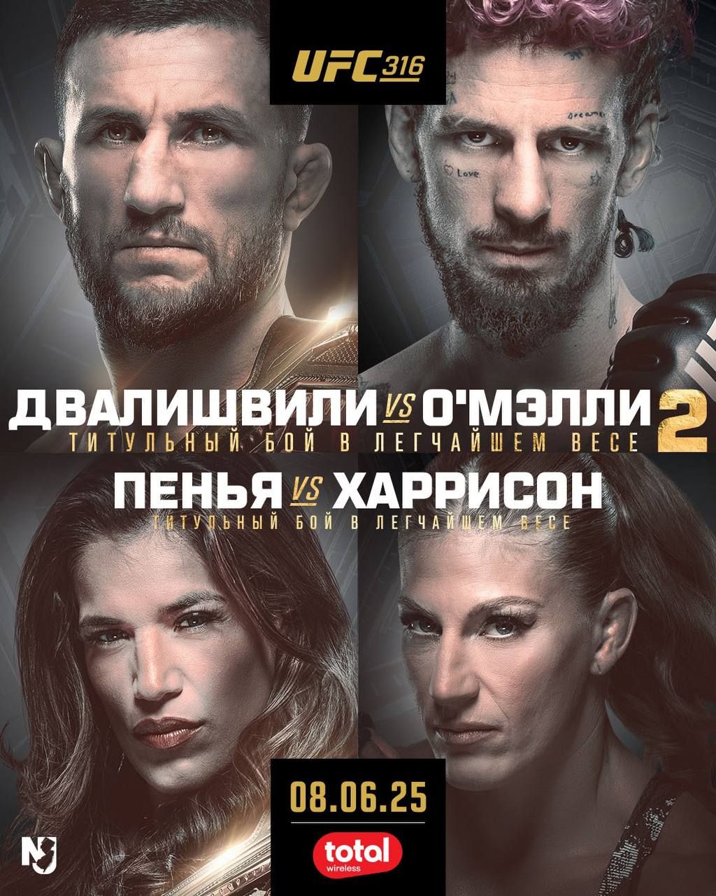 Турнир UFC 316 запланирован на 17 июня. Менее чем за два месяца до события UFC представил официальный постер, на котором изображены главные действующие лица: участники титульного боя в легчайшем весе Двалишвили и О`Мэлли, а также бойцы соглавного поединка Джулианна Пенья и Кайла Харрисон.