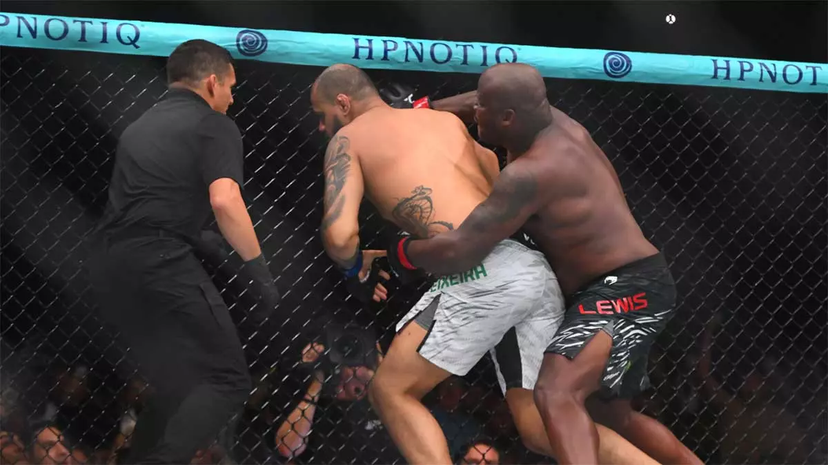 Придя в себя, Льюис активировал свой фирменный агрессивный стиль «swangin’ and bangin’», и вскоре уже Тейшейра оказался в затруднительном положении. Мощный удар Льюиса заметно потряс высокого бразильца. Деррик последовал за этим, нанося еще больше жестких ударов, пока Тейшейра пытался защититься. В попытке удержаться на ногах и восстановиться, Тейшейра отчетливо схватился за сетку обеими руками. Прежде чем он смог отойти или полностью прийти в себя, рефери Джейсон Херцог принял решение остановить бой.
